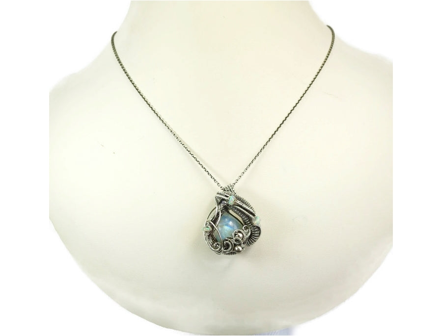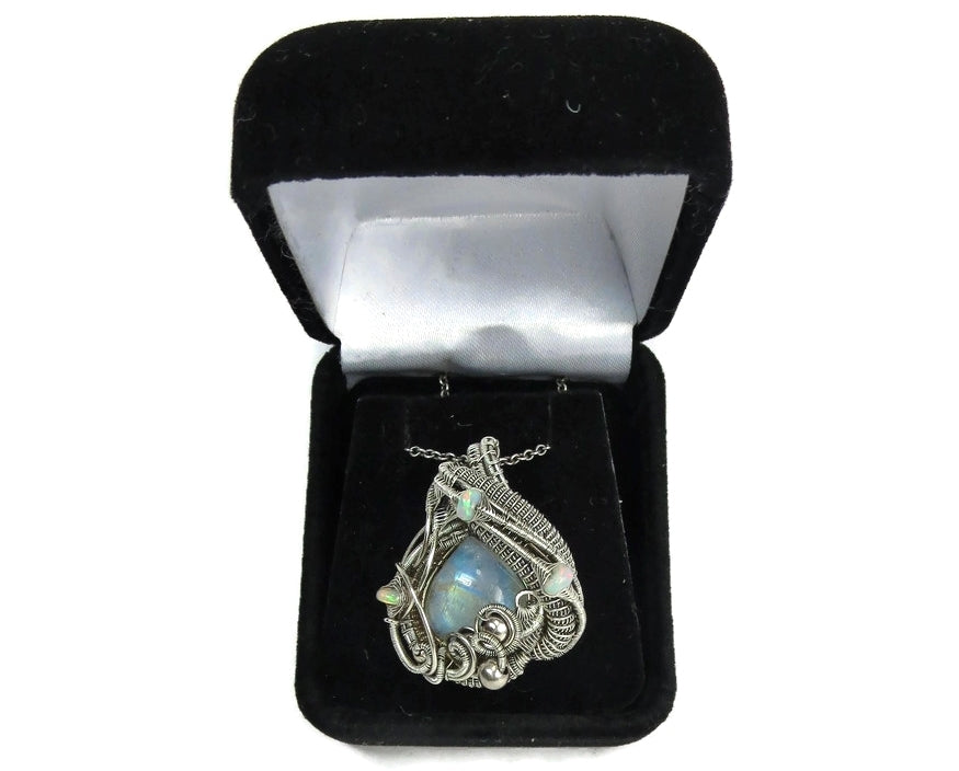 This beautiful hand-woven pendant was made with a natural rainbow moonstone cabochon, set in solid Sterling silver wire, woven gracefully to feature the ethereal blue, yellow and orange glow, emanating from within the stone. Three fiery Ethiopian welo opals with blue, green, red and yellow fire are set in delicate herringbone weaves, adding to the natural beauty of the focal stone. The wire was oxidized naturally with egg yolk, then coated in clear lacquer to preserve the aged finish of the piece over time and resist tarnish. The pendant comes suspended on your choice of chain and measures 31x25x17mm (1.2" x 1.0" x 0.7"). This is a one-of-a-kind item and there won't ever be another like it.
