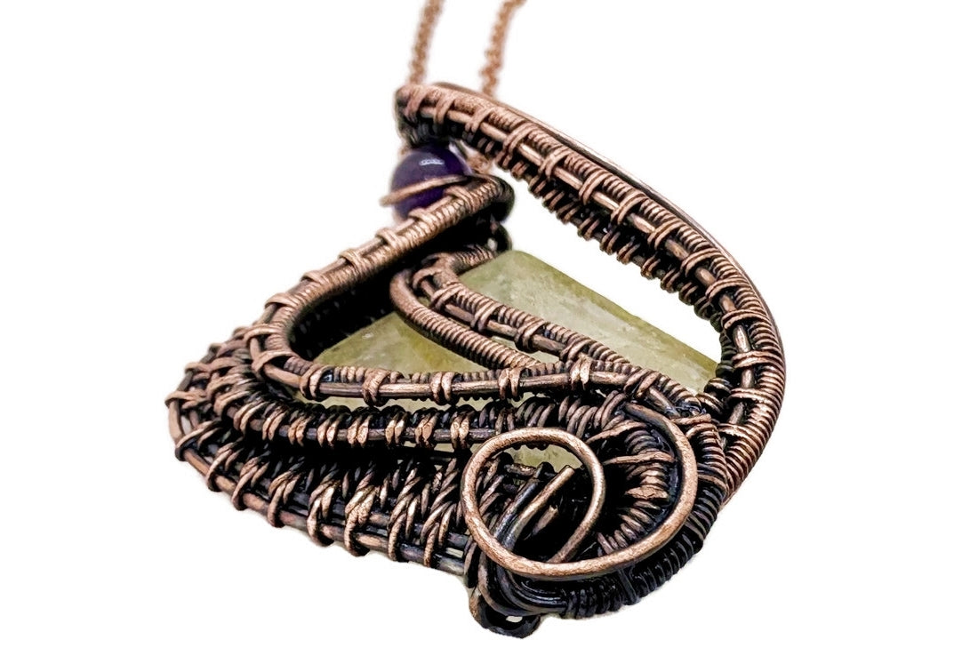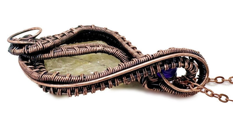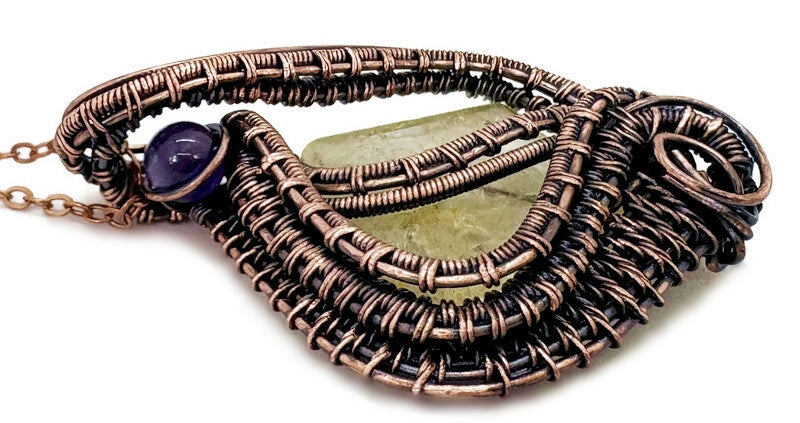 This pendant is composed of faceted citrine cradled in solid copper wire, woven, coiled and draped elaborately across the edges of the stone with a deep purple amethyst sphere, set just inside the bail. The wire was oxidized to bring out the texture of the weave, hand-polished to an aged finish, then sealed in clear lacquer to resist tarnish. This pendant measures 52x36x13mm (2.0" x 1.4" x 0.5") and comes suspended on your choice of chain. Rugged, organic and rich, this pendant truly reflects the raw beauty of nature's finest treasures. Gorgeous!