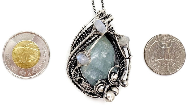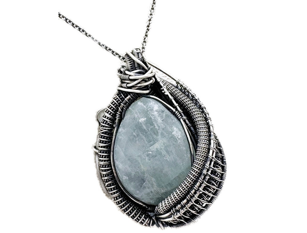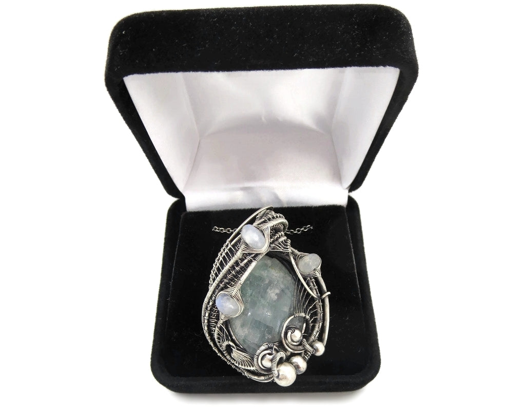 This gorgeous, handcrafted pendant was made with a celestite teardrop stone, set in solid Sterling silver wire, woven to cascade around the edges. Three faceted rainbow moonstones, set in delicate, herringbone weaves, add to the richness of the piece. The entire silver surface of the pendant was oxidized, hand-polished, then lacquered to preserve the finish over time. This pendant comes suspended on your choice of Sterling silver chain and measures 49x36x23mm (1.9" x 1.4" x 0.9"). This is a one-of-a-kind item and there won't ever be another like it!