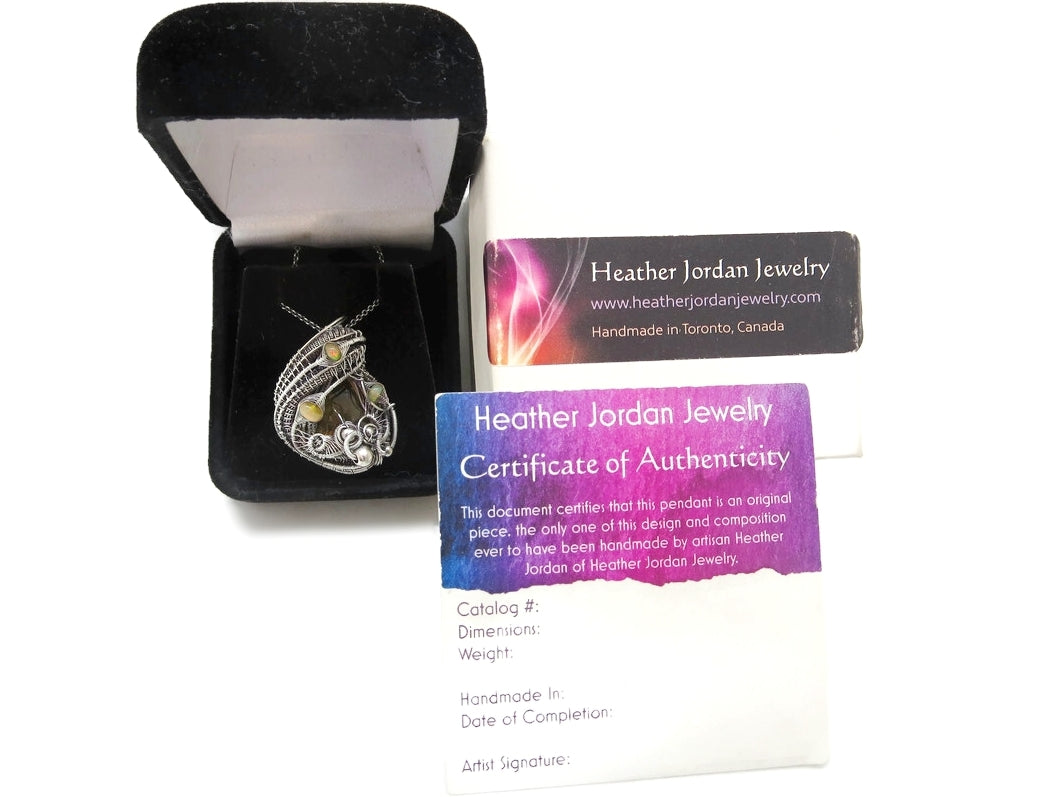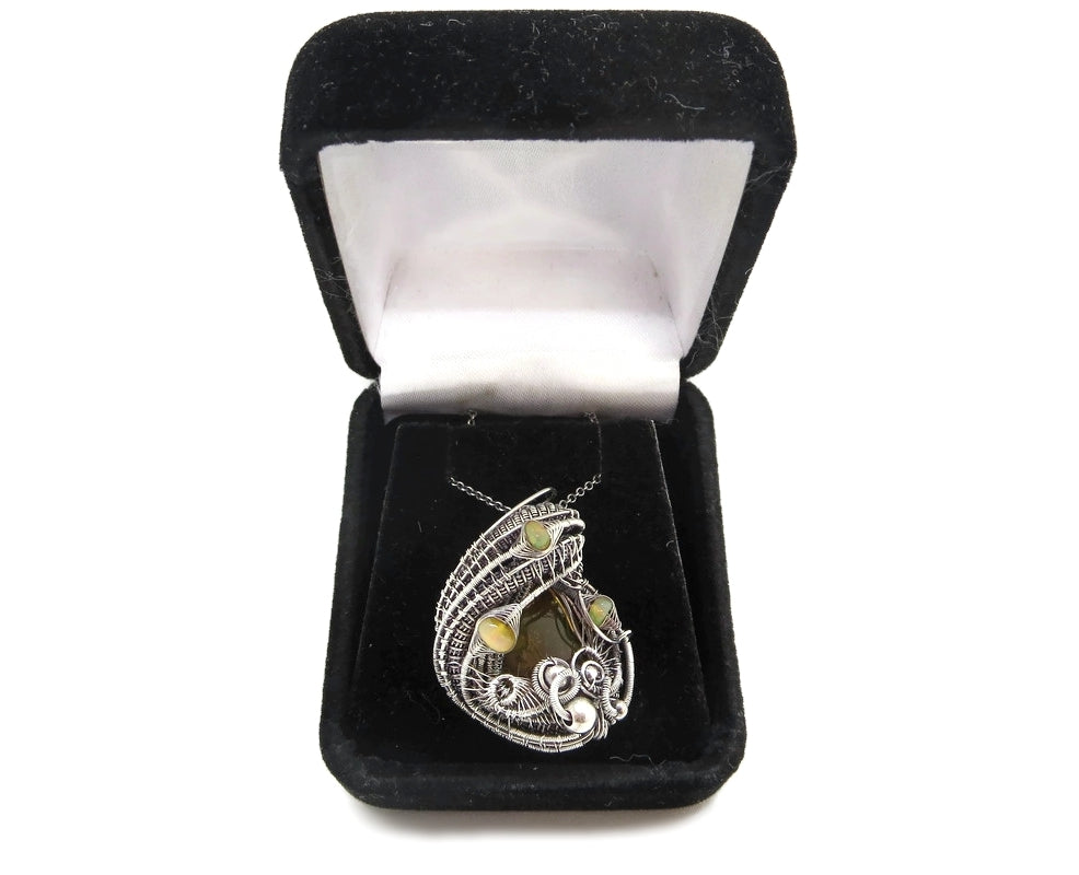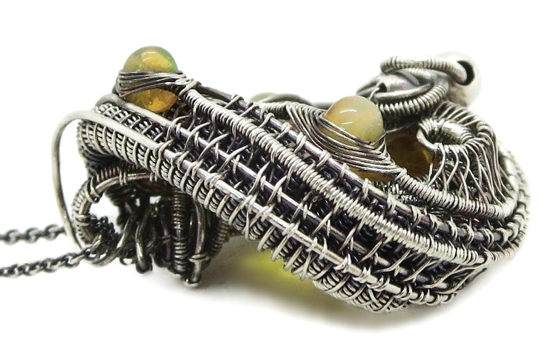 This beautiful wire-wrapped pendant was made with a gorgeous piece of Baltic amber with a gnat inside! Ethiopian welo opals, set in delicate herringbone weaves cascade down silver coils from the top. This one-of-a-kind pendant was woven by-hand with solid, Sterling silver wire, which was oxidized naturally with egg yolk to bring out the texture of the weave, then hand-polished to a glossy luster. The whole pendant measures 29x22x15mm (1.1" x 0.9" x 0.6") and comes suspended on your choice of chain.