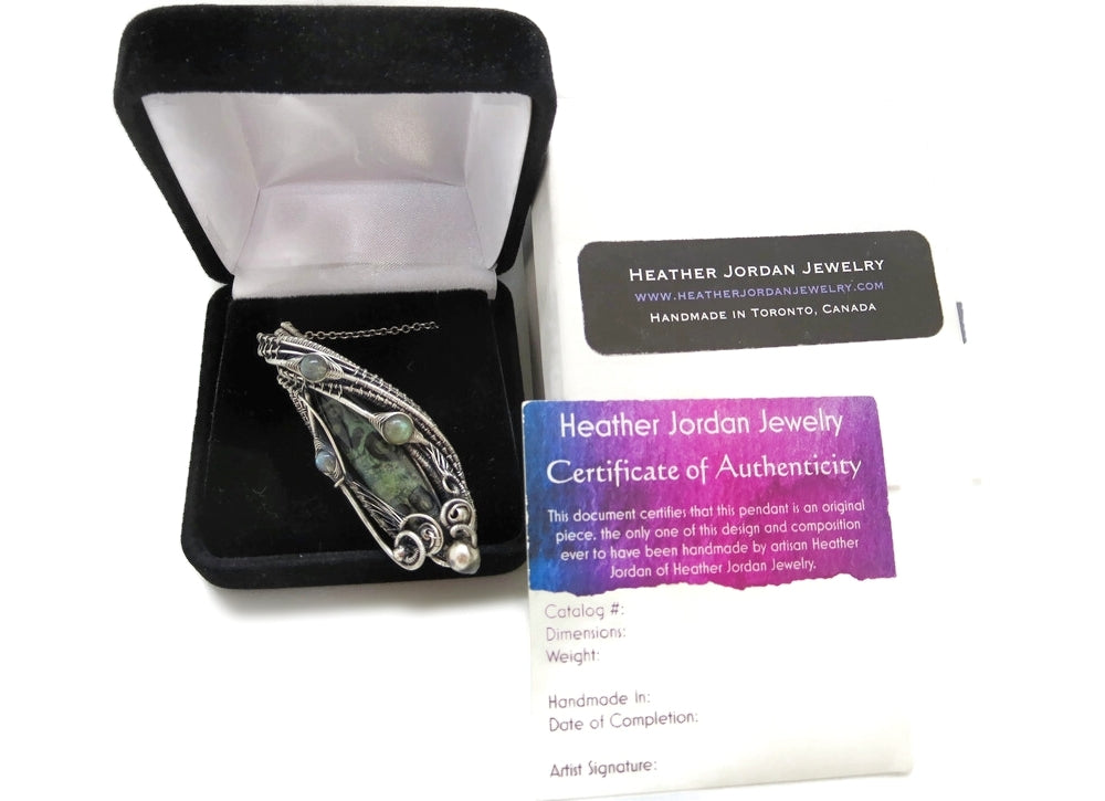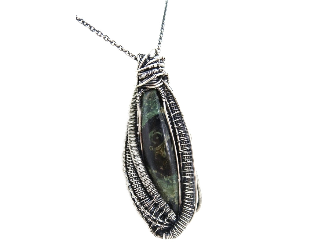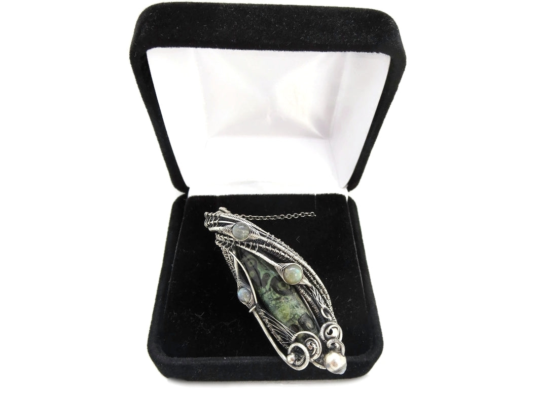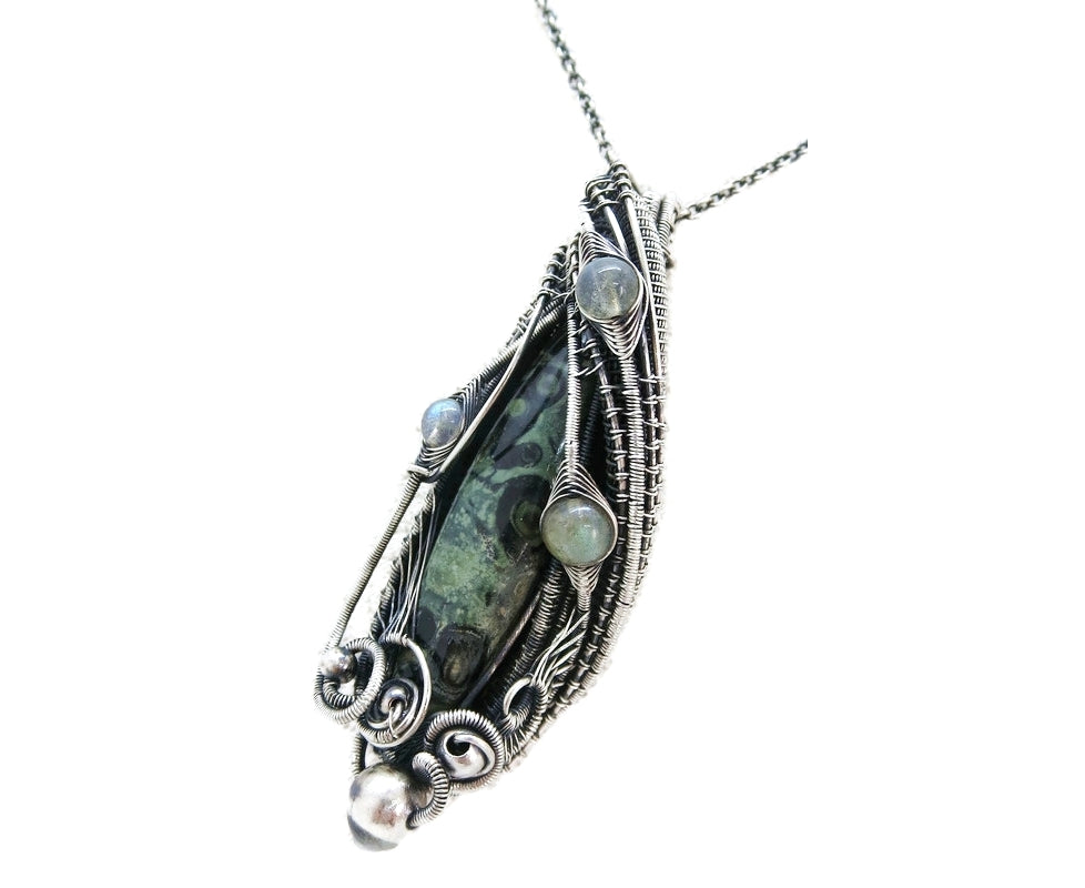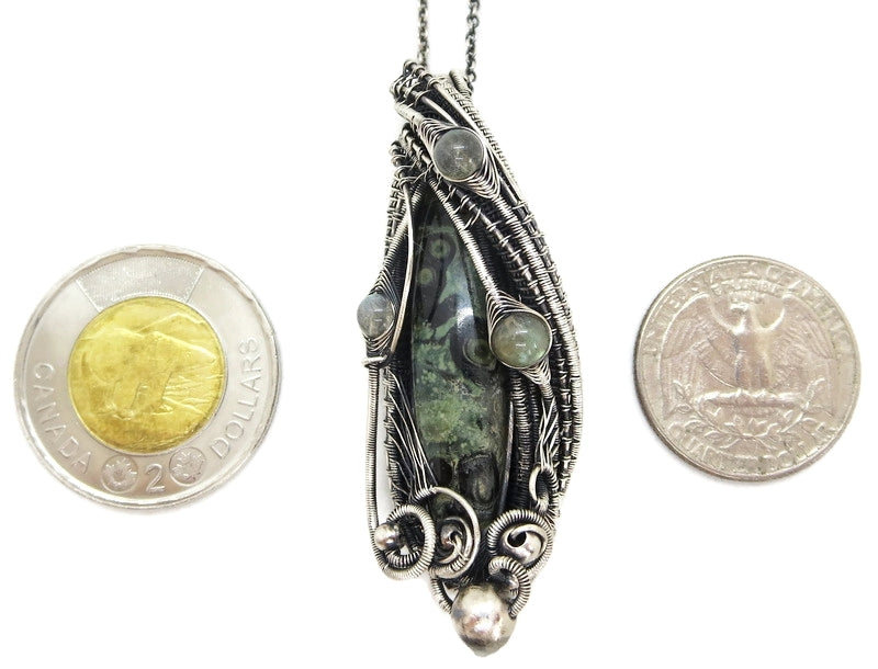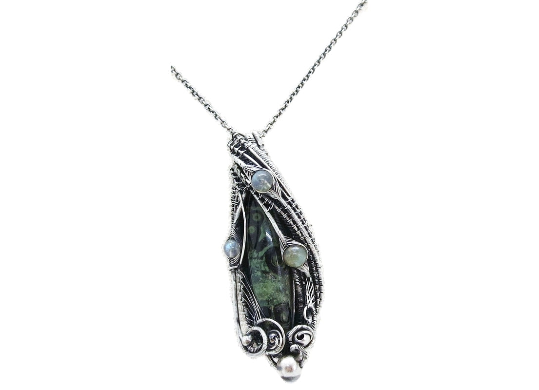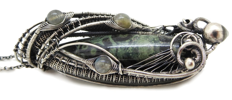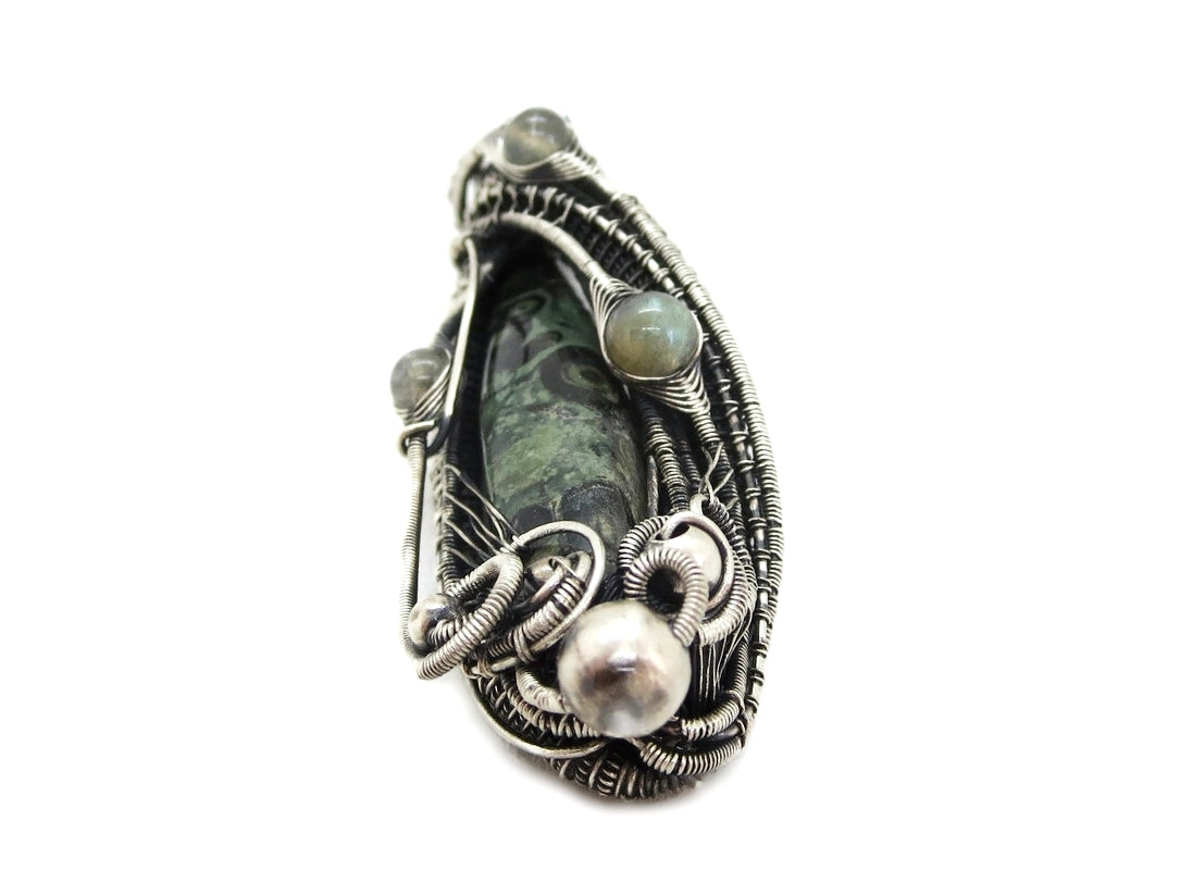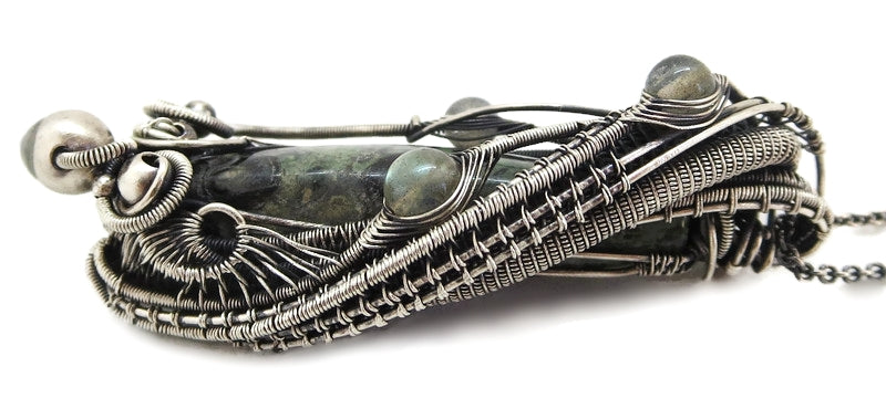 This lovely wire-wrapped pendant is made with a polished petrified stromatolite (a stone also known as "Kambaba jasper"), solid, Sterling silver wire and glowing, labradorite spheres, set in delicate herringbone weaves. The entire silver surface of this pendant was oxidized, hand-polished, then coated in clear lacquer to preserve the aged finish of the piece over time and for ease of care. This gorgeous, handcrafted piece, which comes suspended on your choice of chain. The pendant measures 54x22x16mm (2.1" x 0.9" x 0.6").