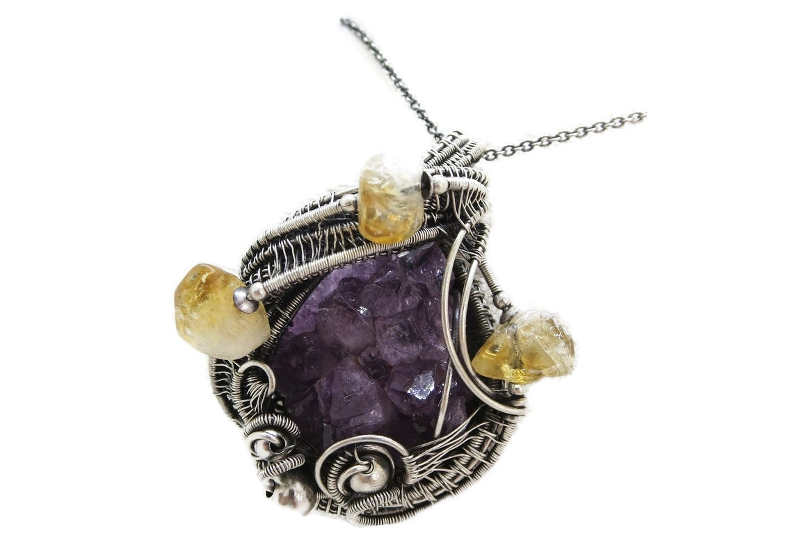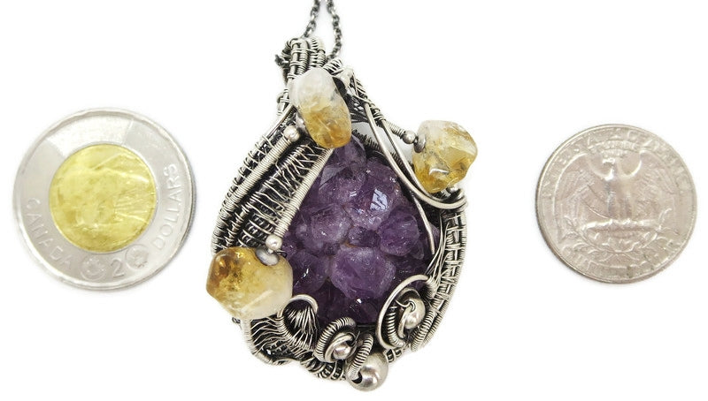 This big, beautiful pendant is composed of a natural amethyst druzy (crystal cluster) cut from the tip of a stalactite, lovingly cradled in solid Sterling silver wire, woven, coiled and draped elaborately across the edges of the stone with raw citrine nuggets set in Sterling silver bead caps. The wire was oxidized to bring out the texture of the weave, then hand-polished to a glossy lustre. This pendant measures 49x38x27mm (1.9" x 1.5" x 1.1") and comes suspended on your choice of chain. Rugged, organic and rich, this pendant truly reflects the raw beauty of nature's finest treasures. Gorgeous!