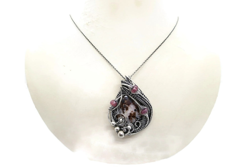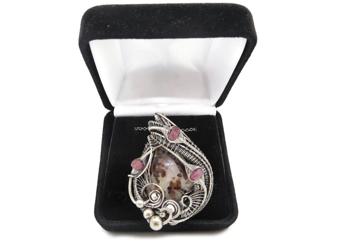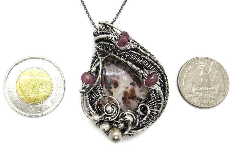 This gorgeous pendant was handcrafted with a natural, polished cabochon containing several UV-fluorescent (365 nm) minerals, namely Franklinite, Willemite and calcite. Faceted pink sapphire beads accent the main focal stone, fluorescing bright pink under the same UV light. Solid Sterling silver wire was gracefully woven to cascade around the stones in this stunning, one-of-a-kind piece. The wire was oxidized, then hand polished to an aged finish. The pendant is very large, measuring 53x39x20mm (2.1" x 1.5" x 0.8") and comes suspended on your choice of chain.